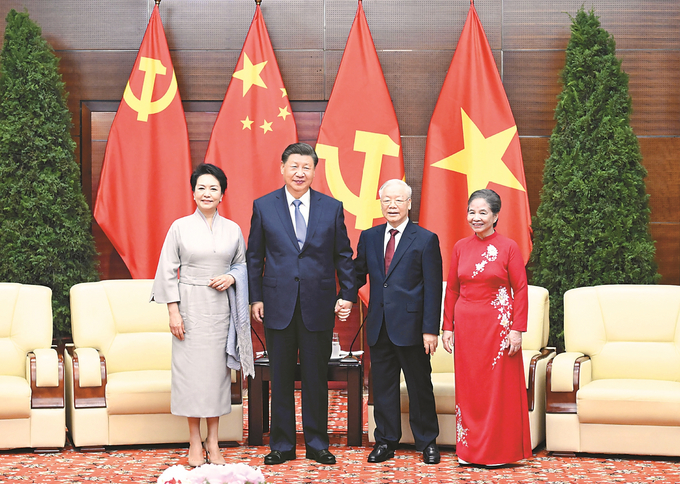回首过去,我们志同道合、守望相助。近代以来,中越两党和两国人民坚守共同理想信念,在争取国家独立和民族解放事业进程中风雨同舟、相互支持。胡志明主席的著名诗句“越中情谊深、同志加兄弟”,成为两国人民对那段峥嵘岁月难以磨灭的历史记忆。立足当下,我们初心如磐、合作共赢。建立全面战略合作伙伴关系15年来,中越两党坚持以人民为中心,大力推进互利合作,给两国人民带来实实在在的利益。展望未来,我们前途相关、命运与共。中国正在以中国式现代化全面推进强国建设、民族复兴伟业,越南正在大力推进工业化现代化建设。中国坚定不移走和平发展道路,坚持与邻为善、以邻为伴的周边外交方针和亲诚惠容的周边外交理念,让中国式现代化更多惠及周边国家。