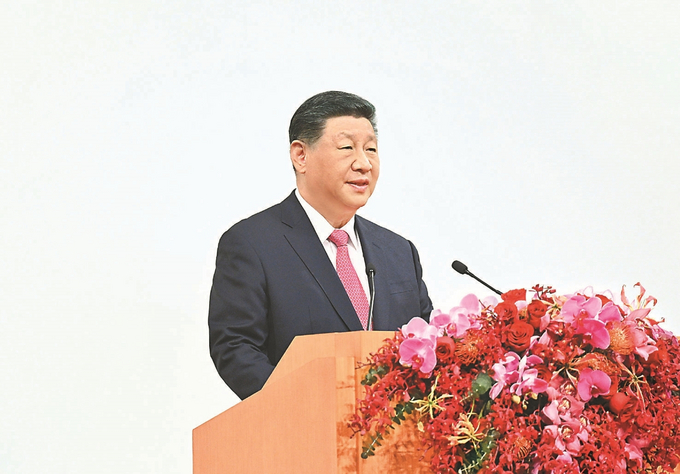 习近平指出,今年是中华人民共和国成立75周年,中国共产党二十届三中全会对进一步全面深化改革、推进中国式现代化作出系统部署,强国建设已经展开壮美画卷并呈现出无比光明的前景,中华民族正以不可阻挡的步伐迈向伟大复兴。只要全面准确、坚定不移贯彻“一国两制”方针,有特别行政区政府和社会各界共同努力,有伟大祖国作坚强后盾,澳门一定能打开发展新天地、不断创造新辉煌,一定能为以中国式现代化全面推进强国建设、民族复兴伟业作出更大贡献。(讲话全文见2版)